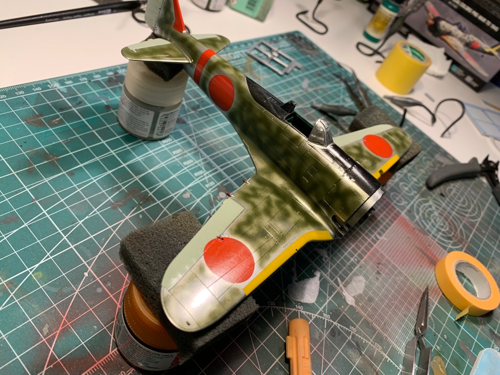 When I was ready to paint, I mixed up a relatively thin ratio of paint, this time using Tamiya acrylic, and free-handed the camo squiggles, being careful to stay away from the markings. I had a cotton bud dampened with water to clean up any errors but don’t recall using it very much. With the squiggles down, I thinned the paint mix further and gave the model an all-over light coat which blended it all together and also seemed to represent the actual finish very well, to my eye.