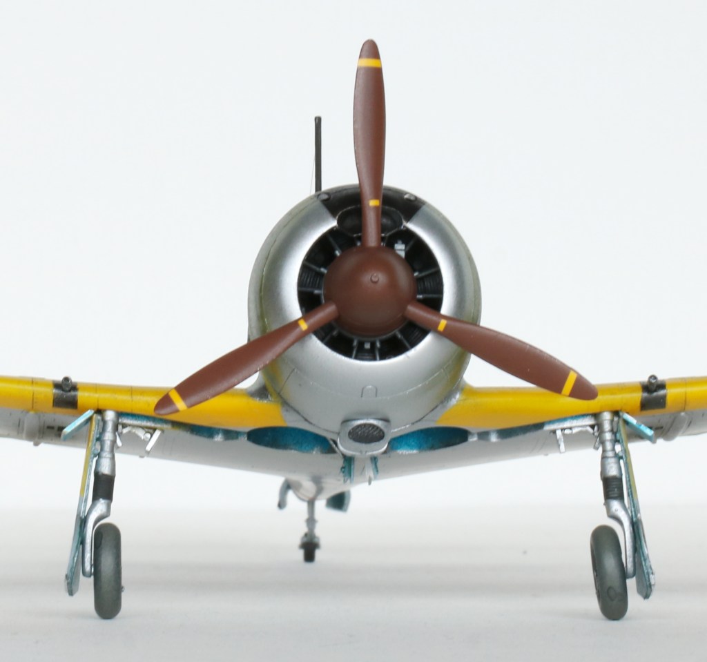 I used some Bare Metal Foil to cover for all of the undercarriage covers as they are the most visible bare metal parts of the aircraft. The antenna was really the only remaining part that was a bit tricky, and I’m not completely convinced that it’s correct in being tight down to the fuselage as I have it. However, when it snapped tight using the smoke trick, I decided not to mess with it. Eagle eyed readers will also notice the port main wheel slightly off vertical; a ham-fisted attempt at alignment broke the axle and I was apparently unable to glue the wheel back on square.