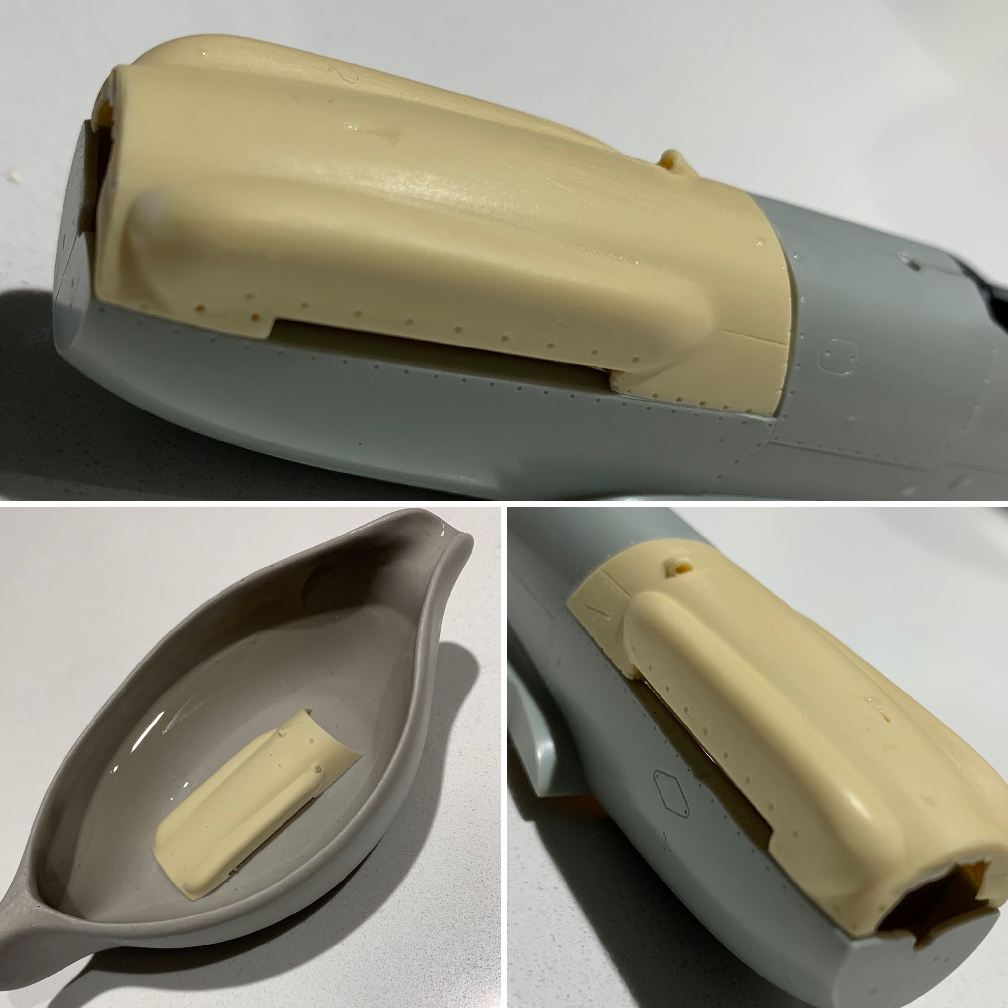 Of note was the engine cowling being slightly undersized which I corrected with hot water and gentle persuasion. I needed to add a piece of sheet plastic to the nose to contour it correctly but otherwise the corrected nose isn’t far off the actual as can be seen below.