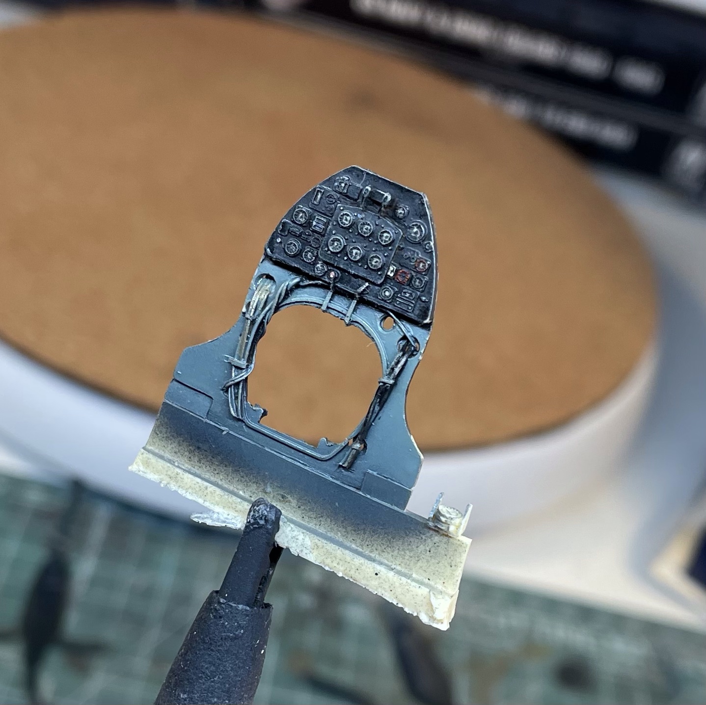 I chose to use the kit prop blades over the resin as the the latter were warped. The kit parts were a good shape, but a little thick. I noticed that there was a painted dashed line around the cockpit entry so I masked and painted that. The previously forgotten gunsight was installed with surprising ease. One of the final touches was a correction to the cannon barrel paint; I noticed that they weren’t white and painted them grey instead.