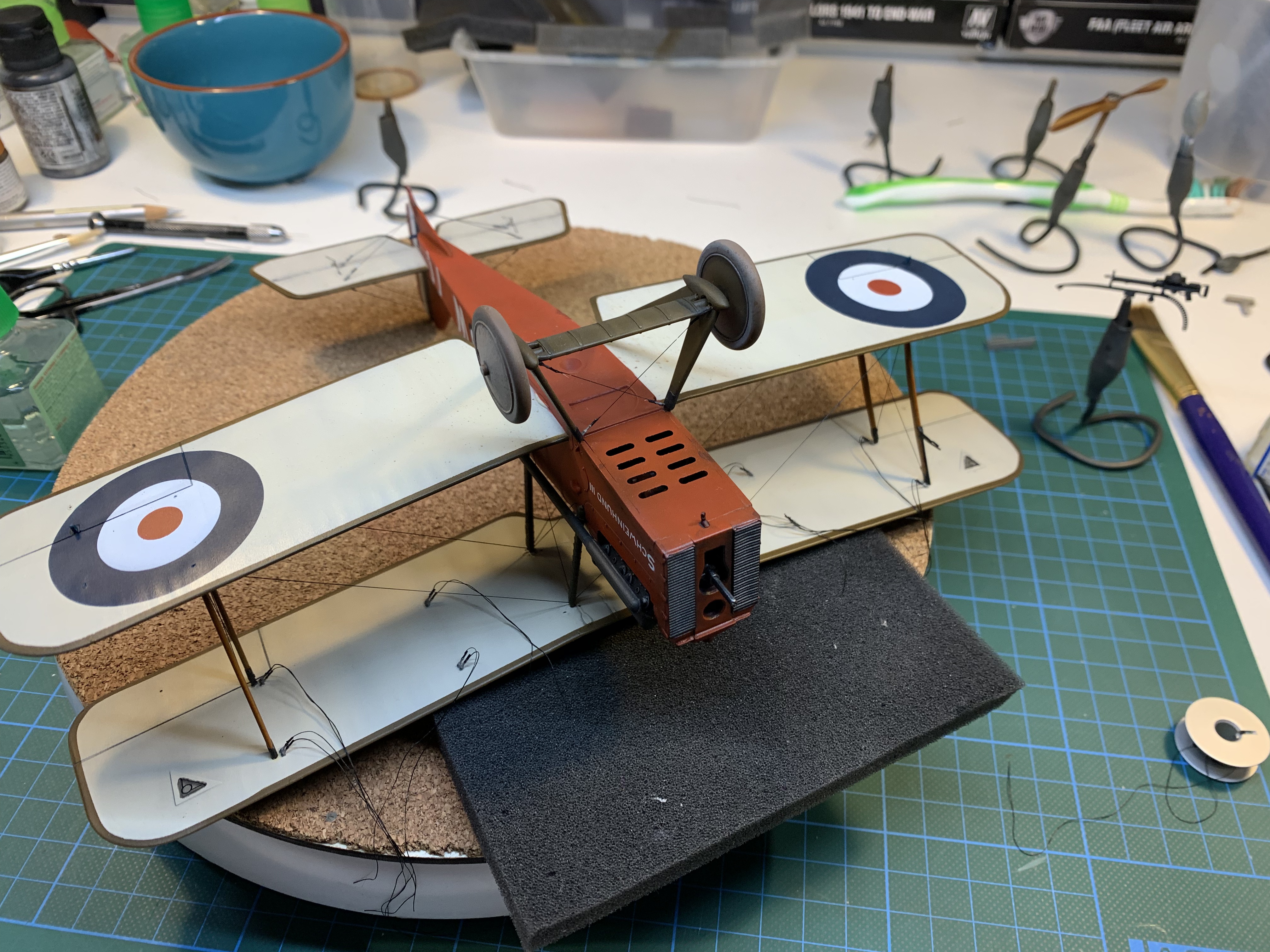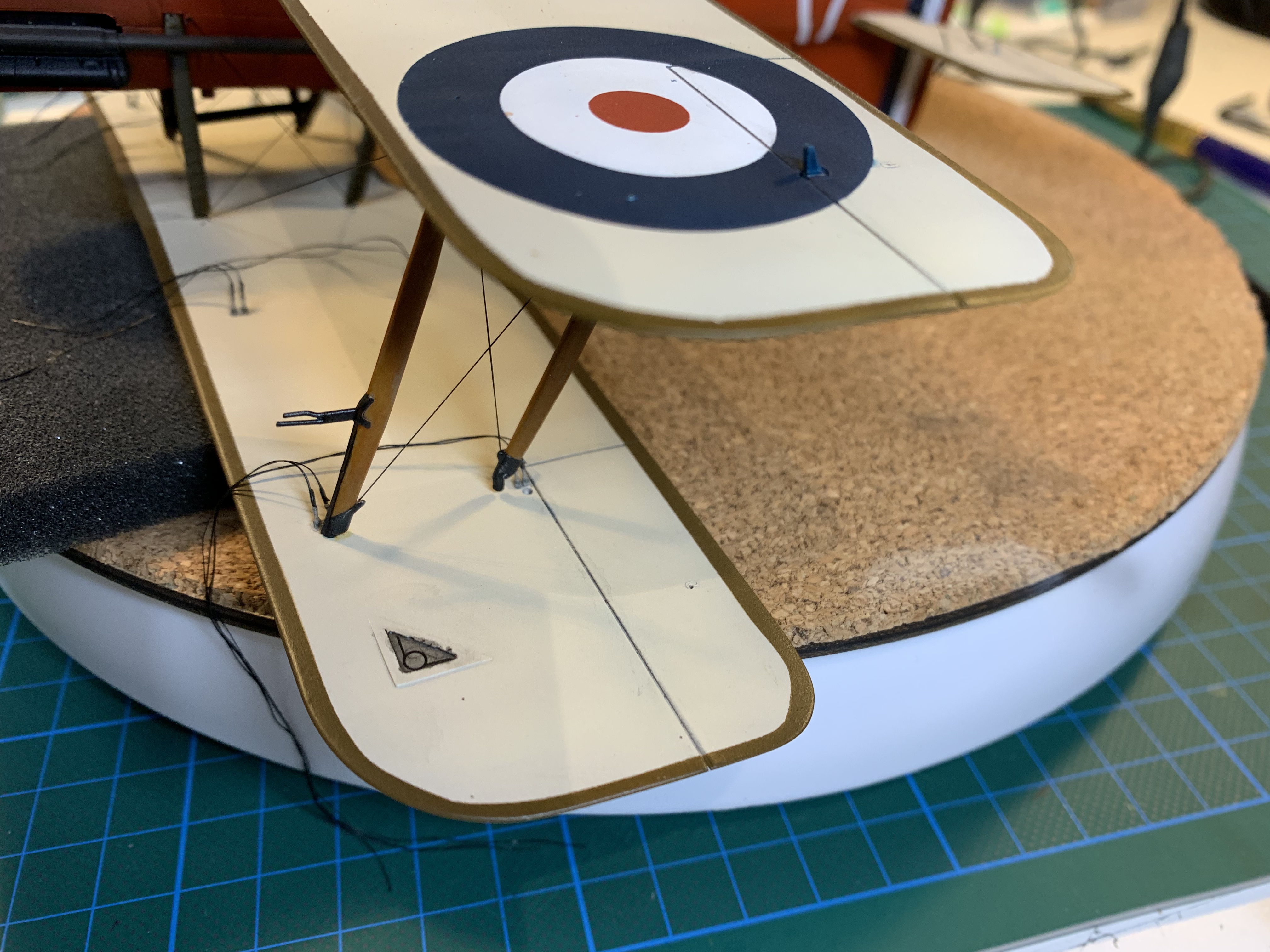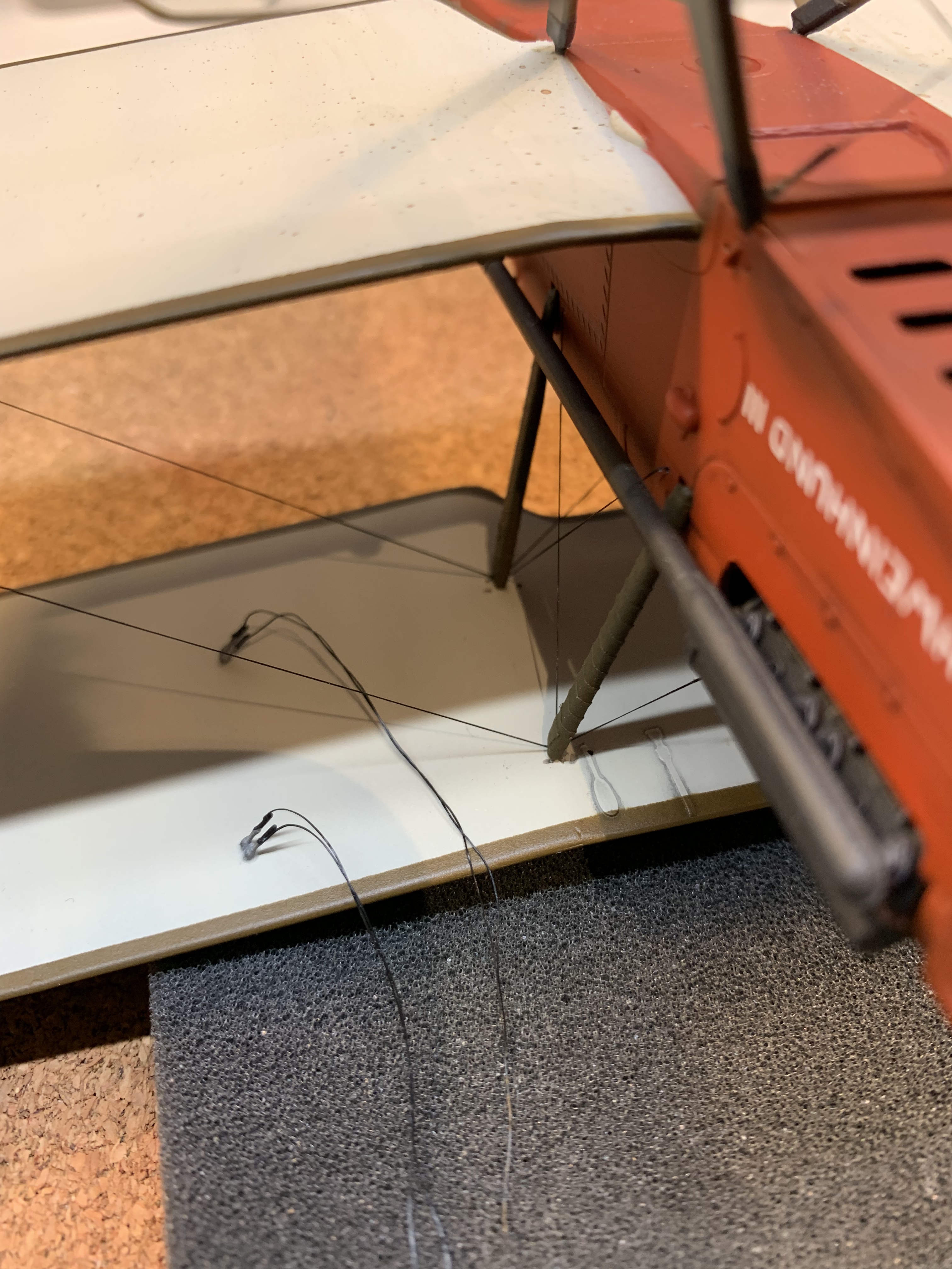 I used fine elasticated line for the rigging. Working methodically began with the tail and the attached all of the ing lines to the upper wing before attaching that to the struts. The top wing was then attached to the struts (which required a little pressure to align correctly) and then I methodically attached each line to its correct placement.