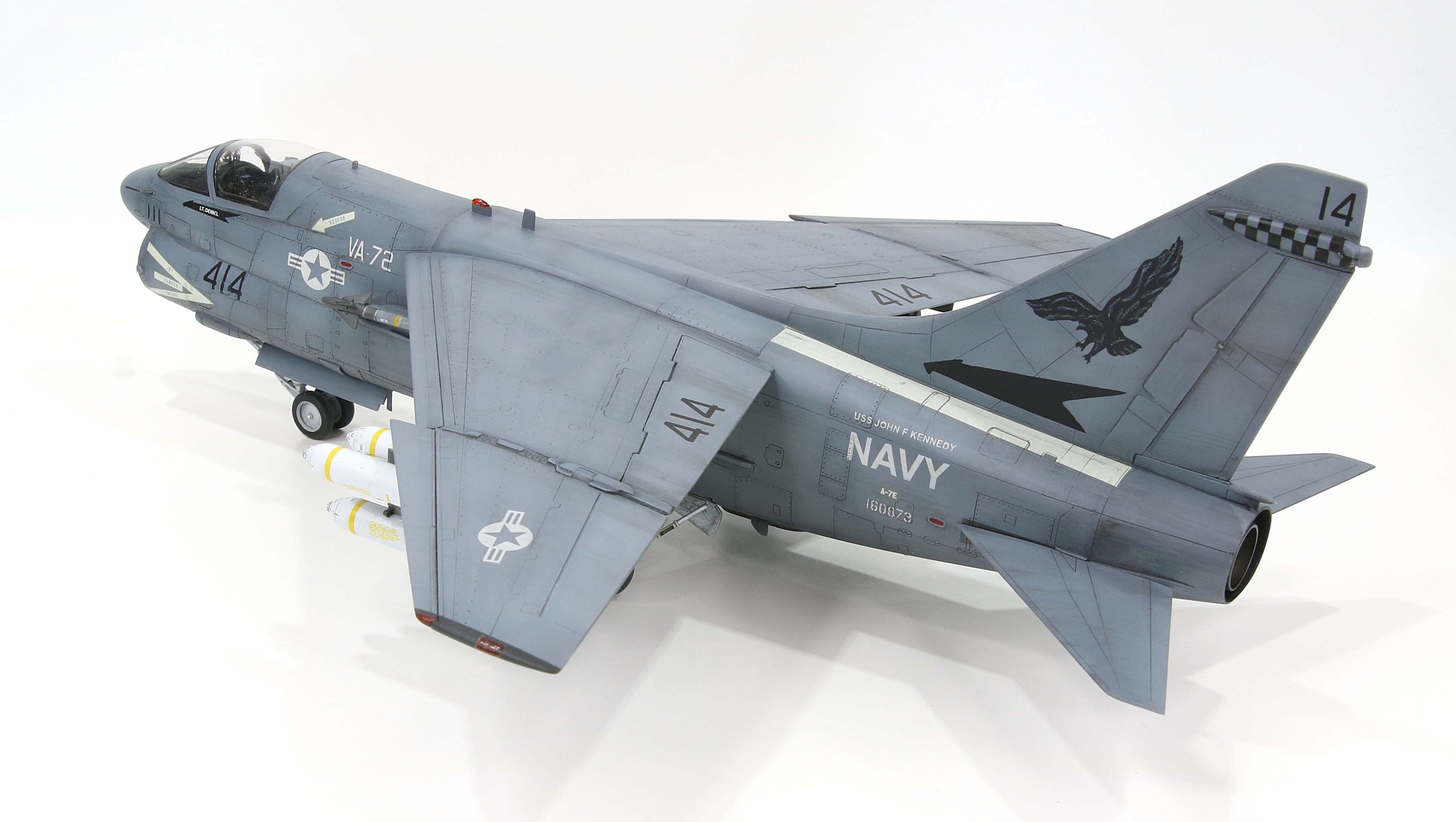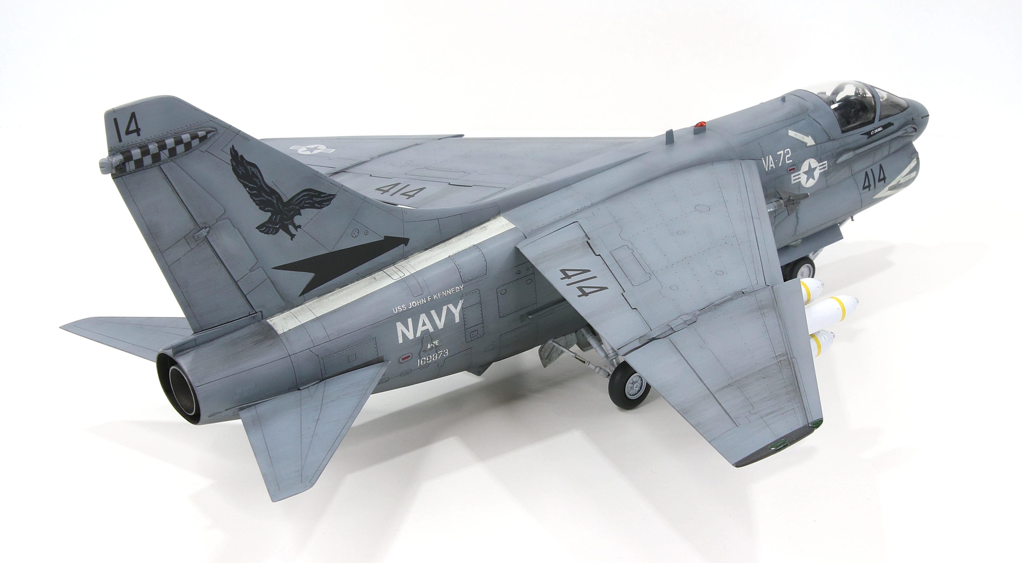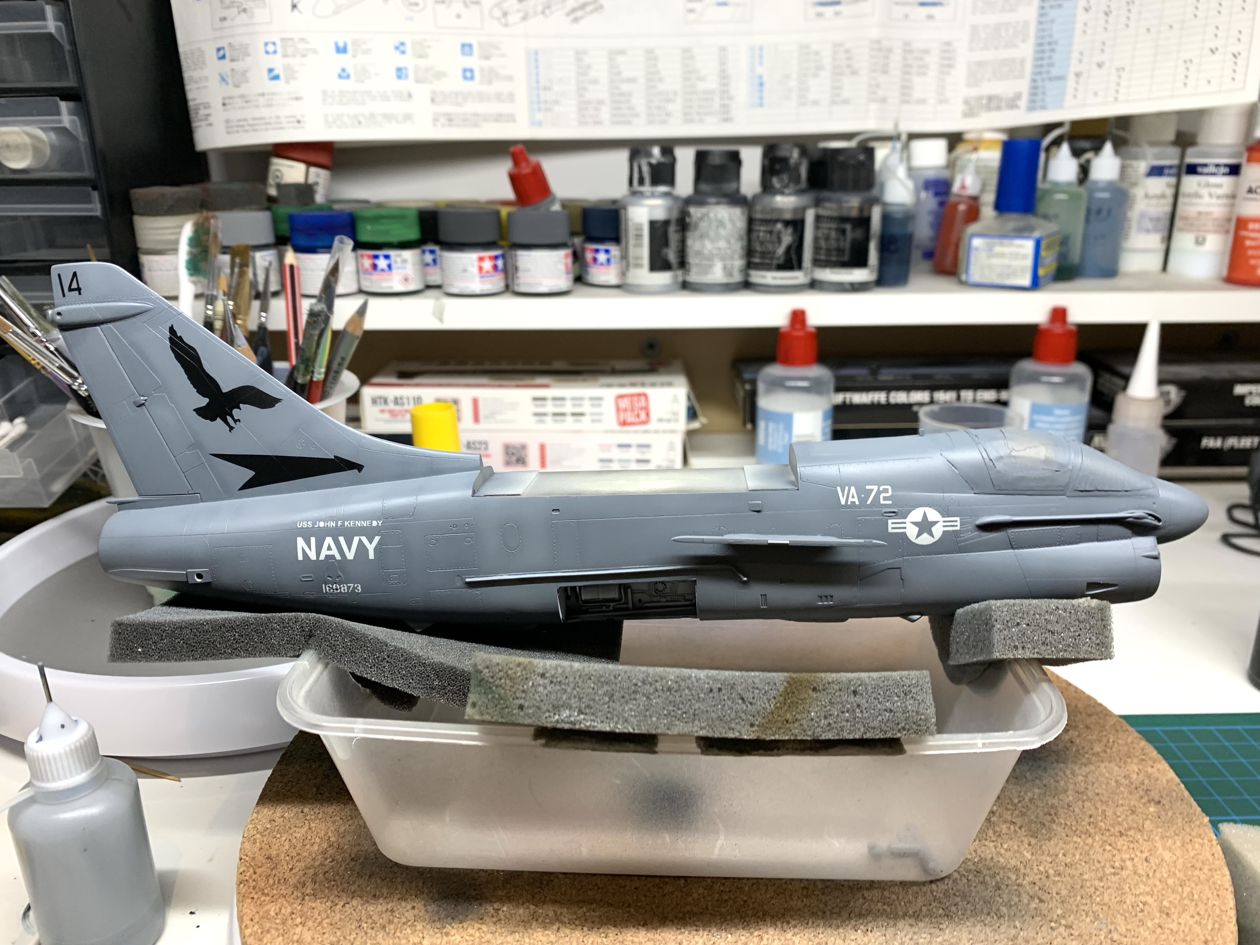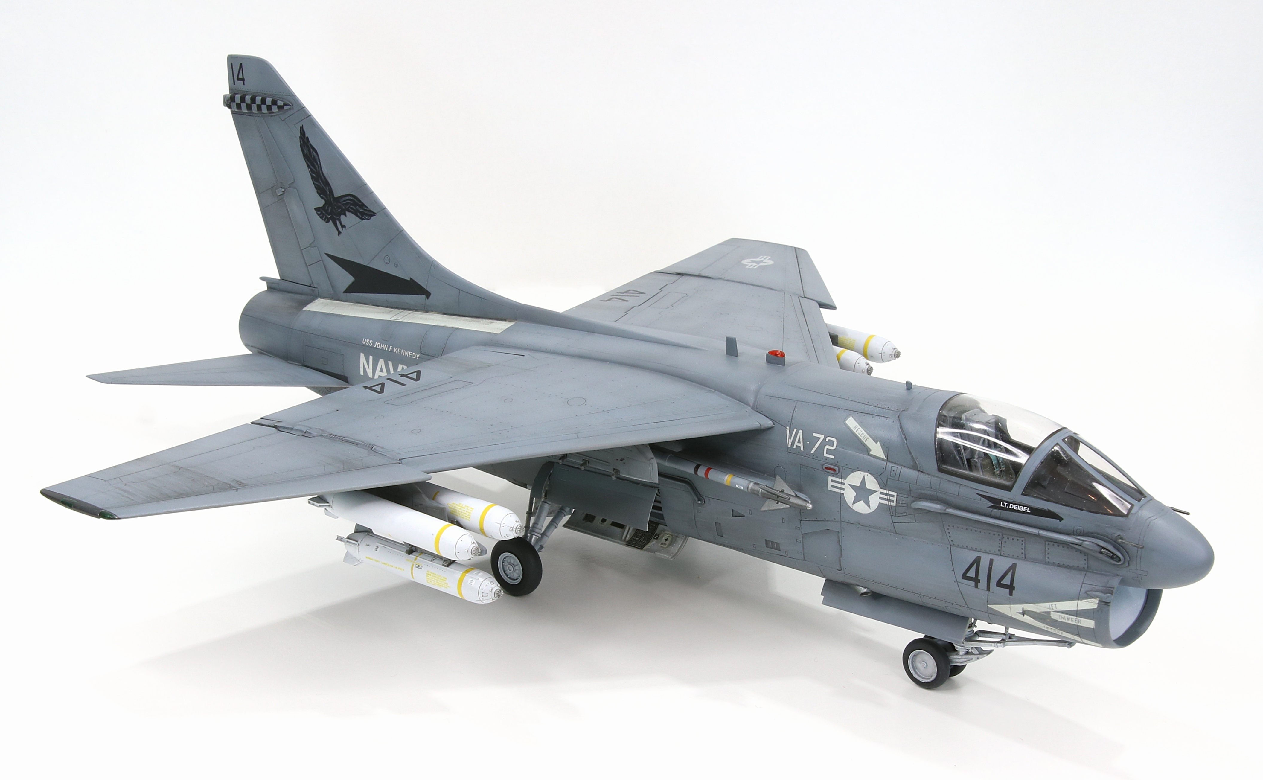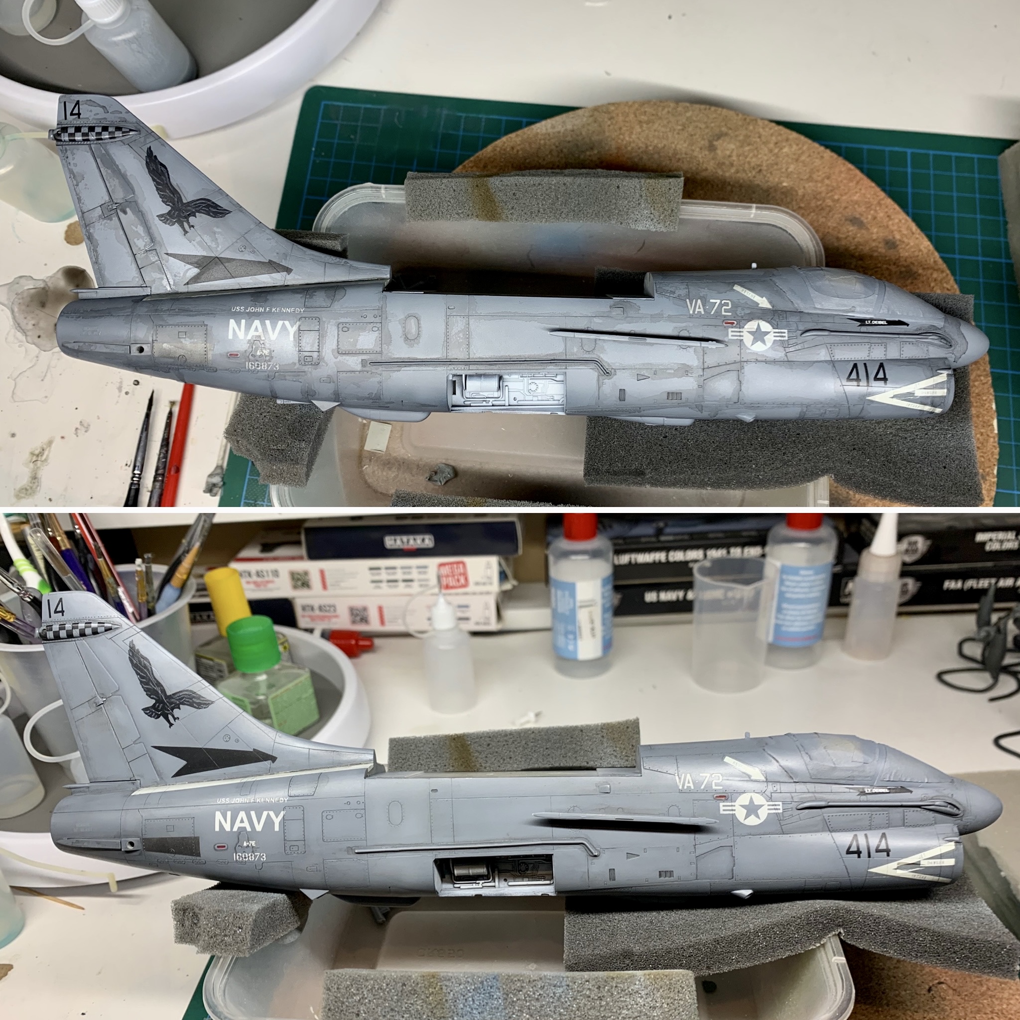 I painted the easy ,markings first such as the airframe number and insignia. The “USS John F Kennedy” turned out really well, I was worried its size would be too much of a challenge but I think it is spot on for a match. I needed to use the kit decal for the “A-7E” because that really was too small to paint.