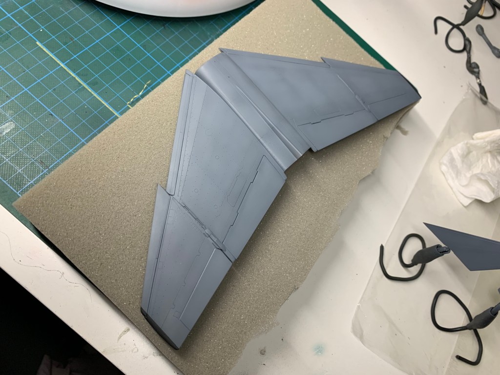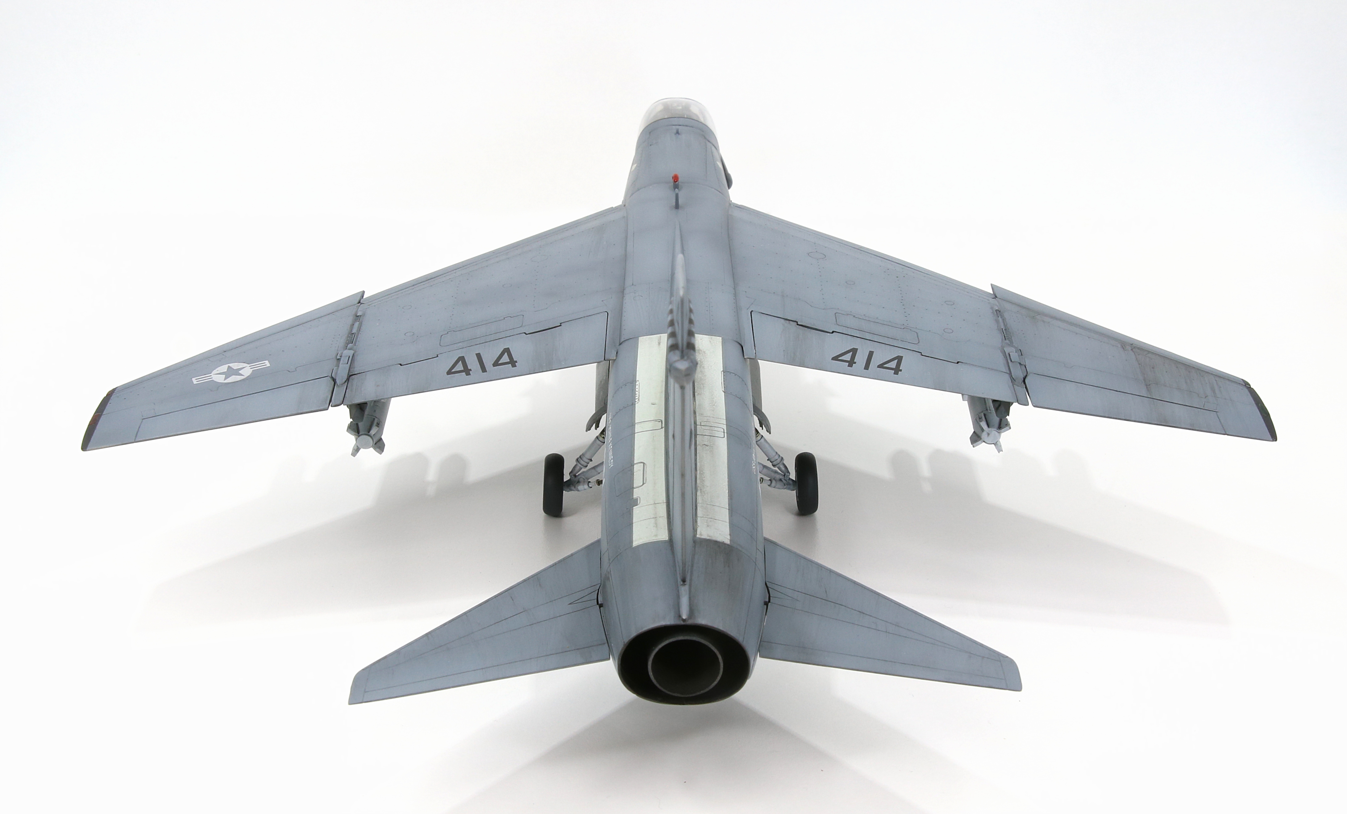 The gloss finish is playing with the effects a little but these pics are a pretty good record of the finish I’m happy with. The finish flat coat will lighten the grey and accent the weathering a little more. The wings are now attached and there’s a little work to do on the seams but I’m happy with the raw join and it won’t take much to make the seam disappear sufficiently. I will need to do something about the mismatch greys though; for example the fin spine is considerably lighter on the wings section than it is on the fuselage section, and the contrast is a little too strong across the forward seam. Blending it and covering shouldn’t be an issue as there’s really not much of a step or gap to cover. That process will be documented in the next post.