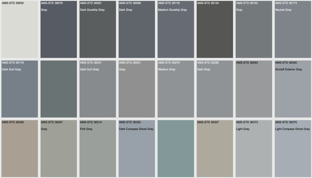 While FED-STD-595 is widely used, different branches of the U.S. military, including the U.S. Navy, often have their own colour standards or specifications that might deviate slightly from the FED-STD-595. In the case of U.S. Navy aircraft, they may use specific shades like “Naval Aircraft Grey” rather than referencing an FS number directly.