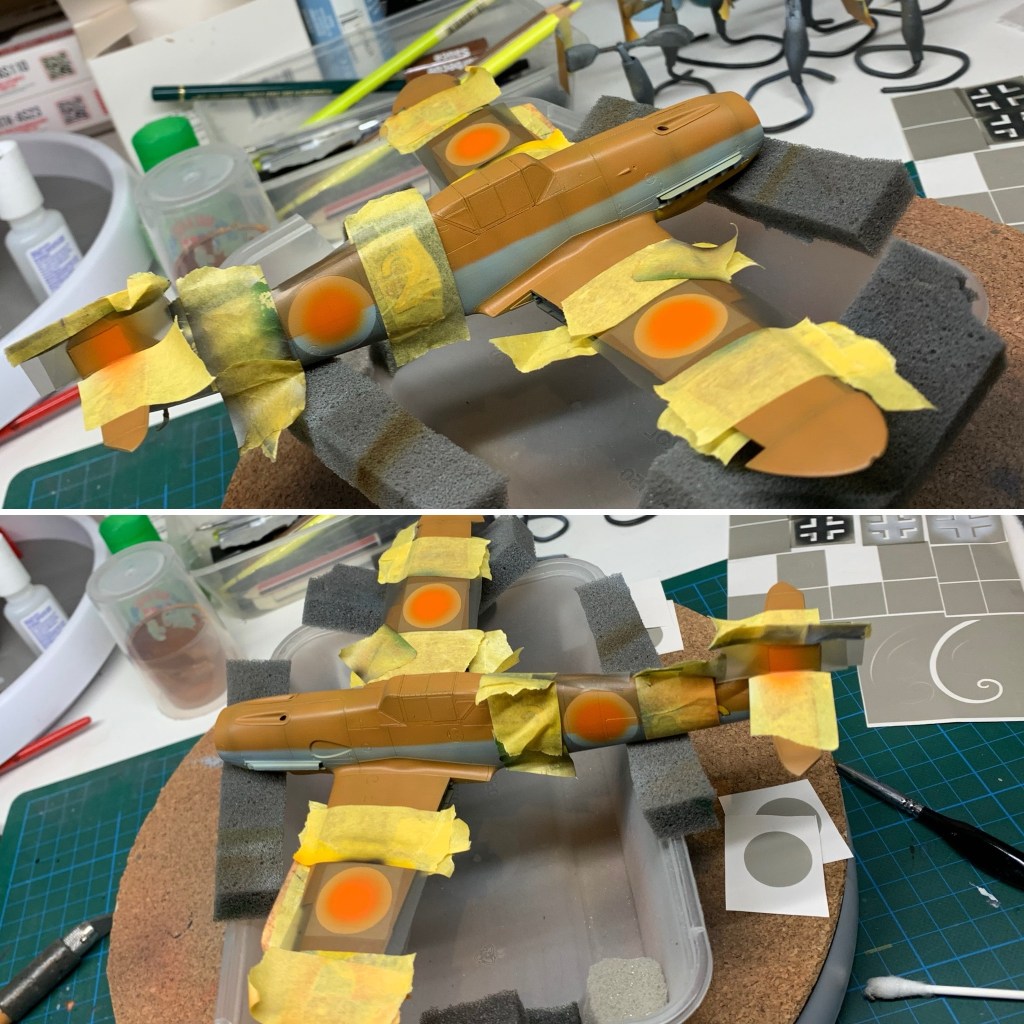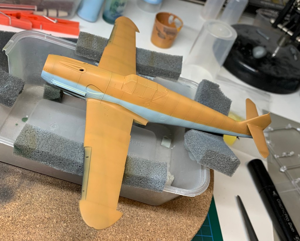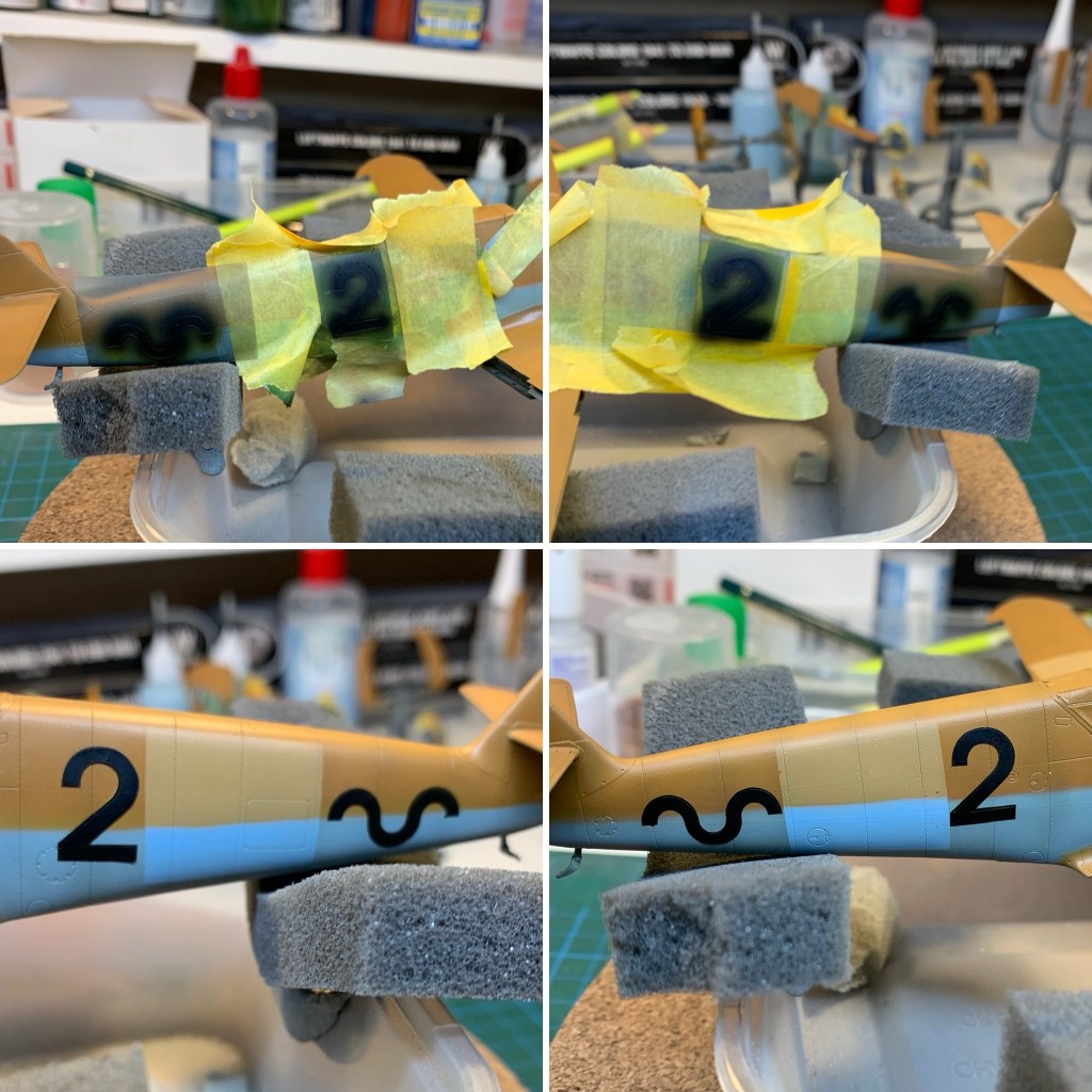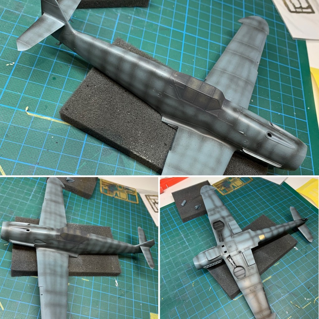 The basic paint scheme is quite clear; RLM 79 or RLM78 at a mid-fuselage demarcation with a tight transition. The transition still looked soft to me, but very tight. Otherwise the initial paint phase looked to be simple.