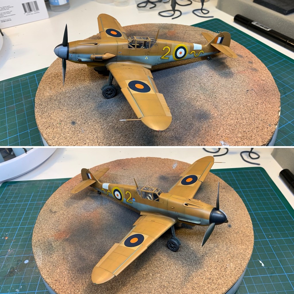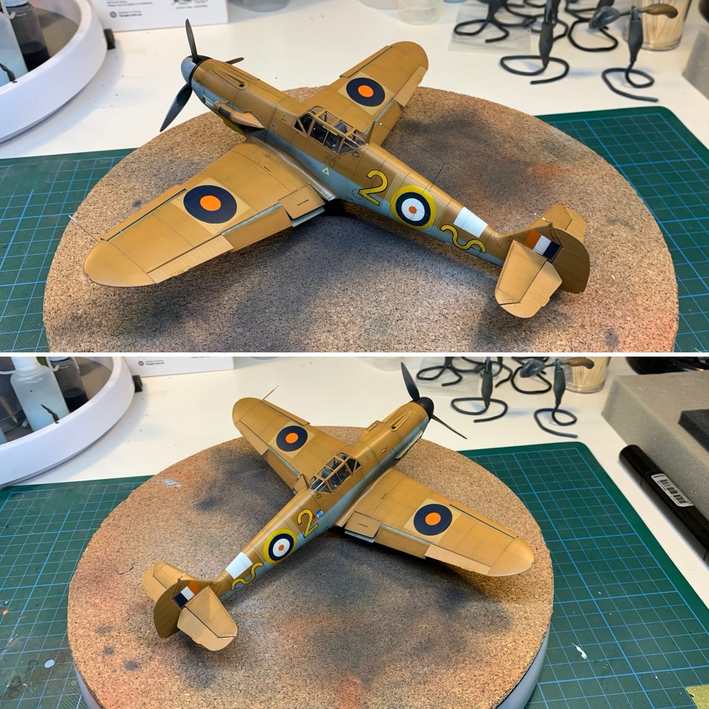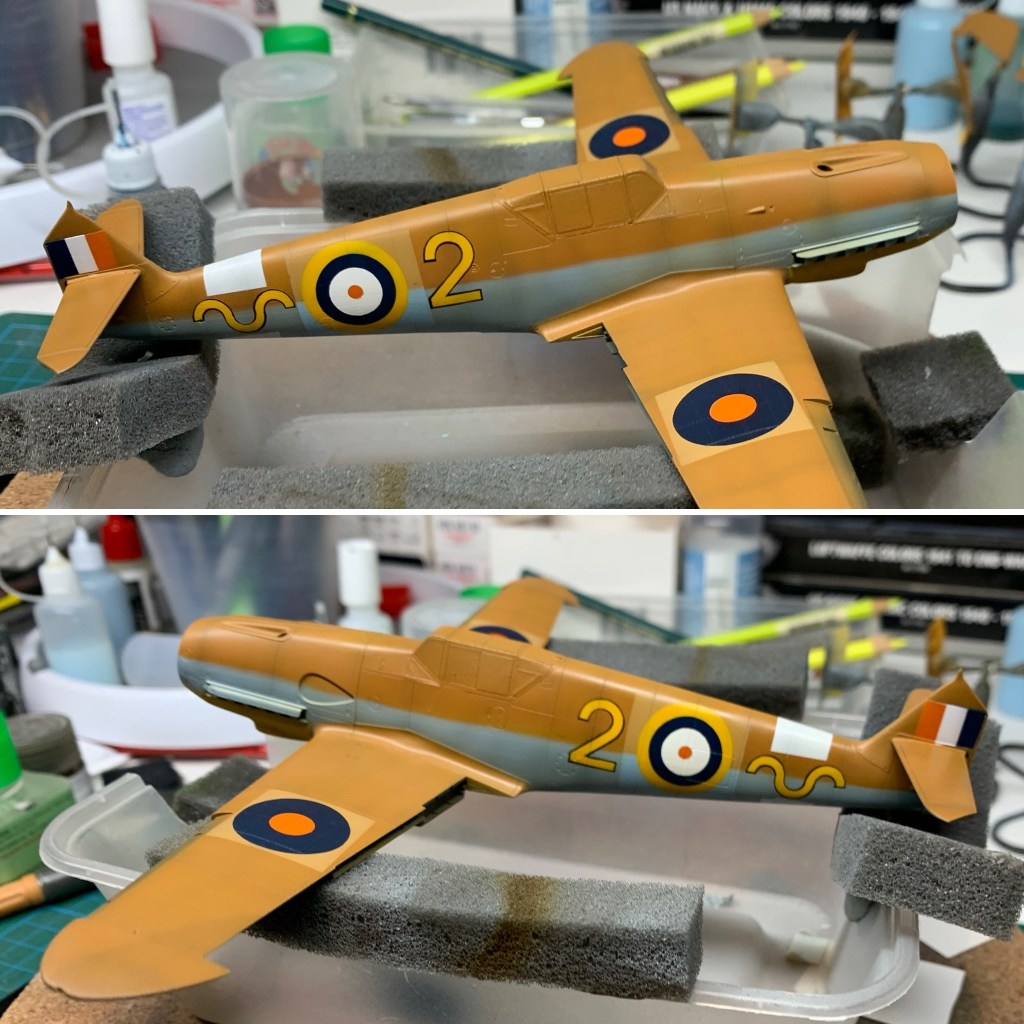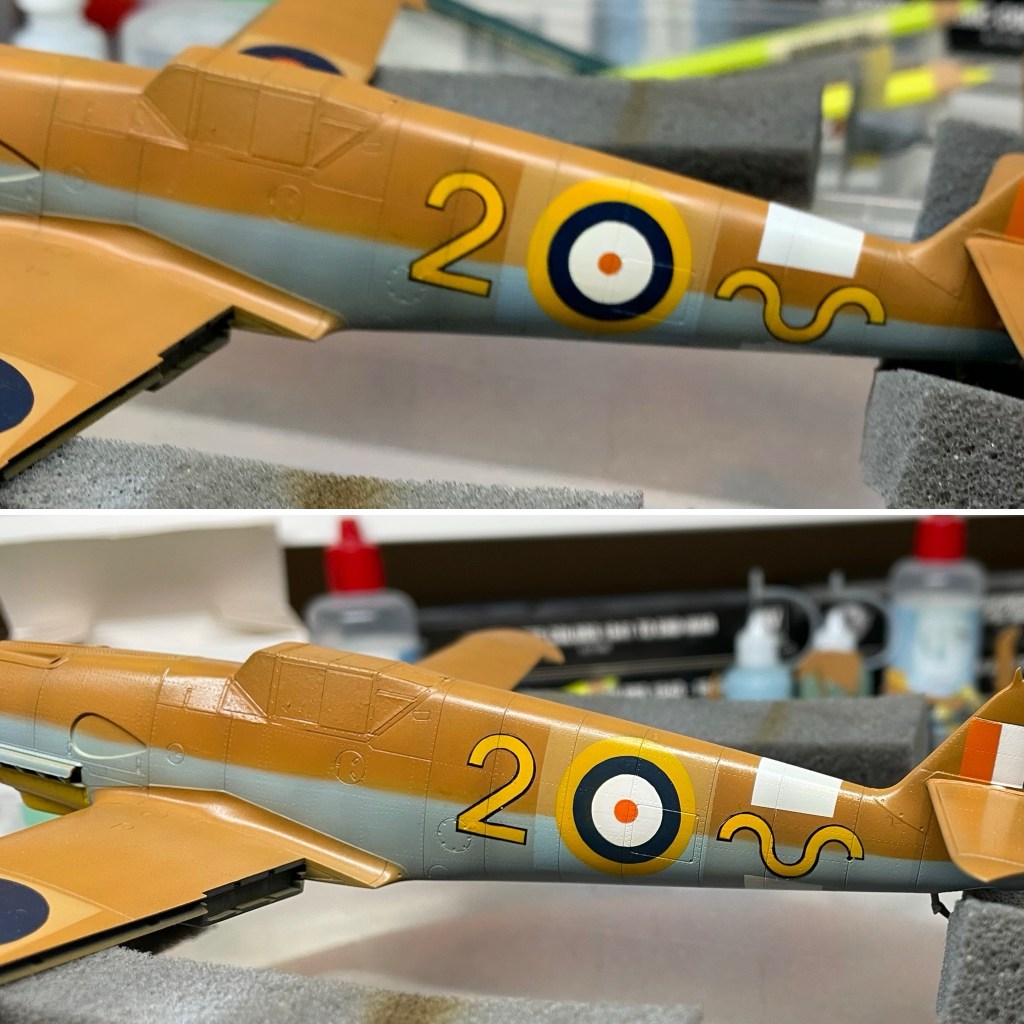 I assumed that the weathering would be fairly light inasmuch was the No.1 Squadron SAAF ground crew would have cleaned it up somewhat during the process of making it airworthy. I know from experience however that the desert makes everything dusty, and this dust when combined with machine fluids makes for a dirty paste. Correspondingly, I added an overall grime wash to create an appearance of “used desert machine” without going very far with chipped paint of other signs of wear and tear because the photos don’t really support that.