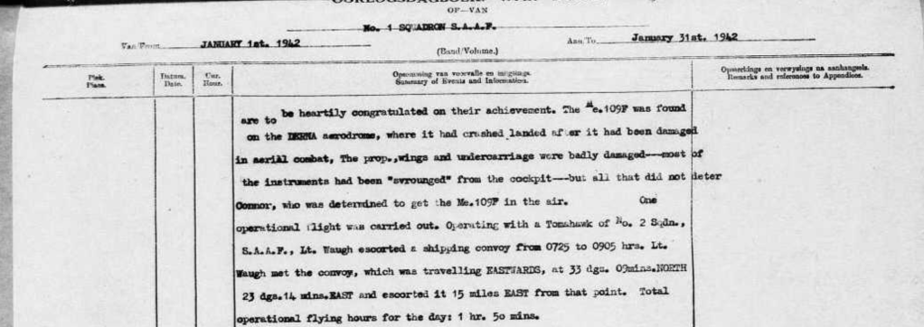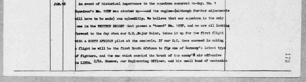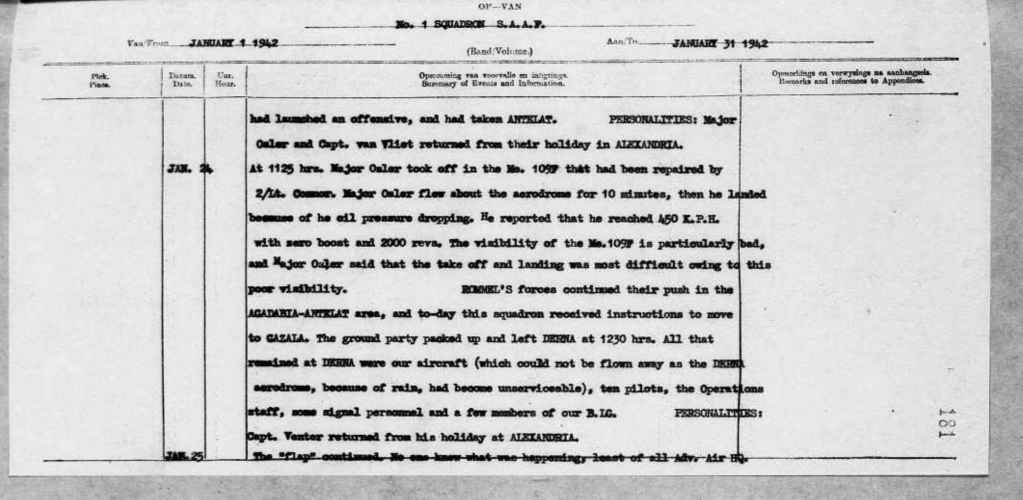Jan 24 – Major Osler flies “Yellow 2” for the first time. Flight time is 10 minutes and he returned to base as engine oil pressure was falling. Squadron receives orders to move to GAZALA due to German forces advance in the AGADAHIA-ANTELAT area.