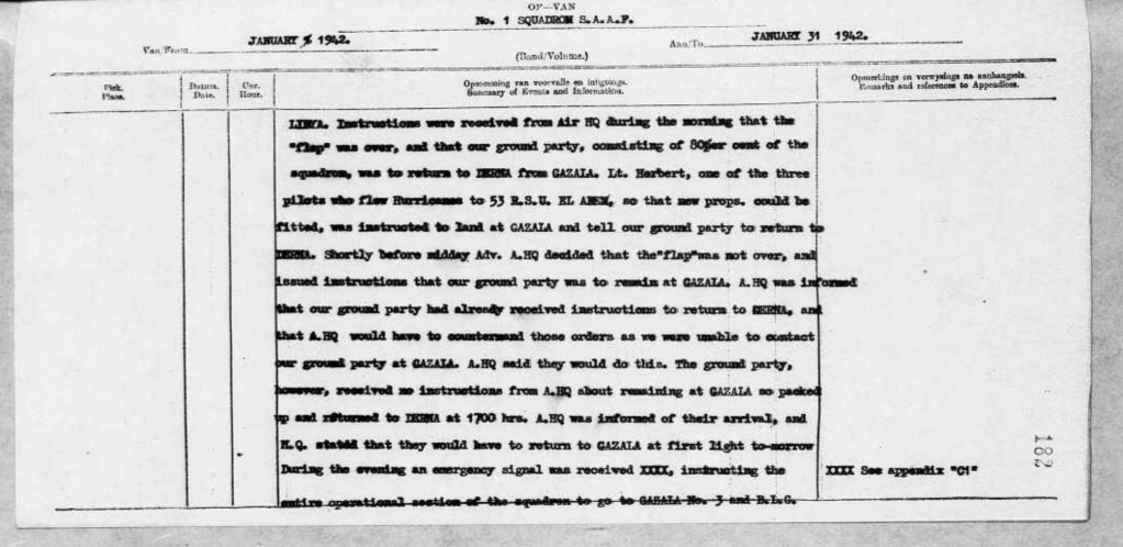 Jan 24/25 – In the morning, the Squadron ground party ordered to return to DERNA. In the afternoon, the orders were countermanded but too late to stop the ground party’s progress and they could not be contacted en route. Ground party arrived DERNA at 1700hrs and were told to return to GAZALA at first light. Major Osler flew “Yellow 2” to MATURBA.