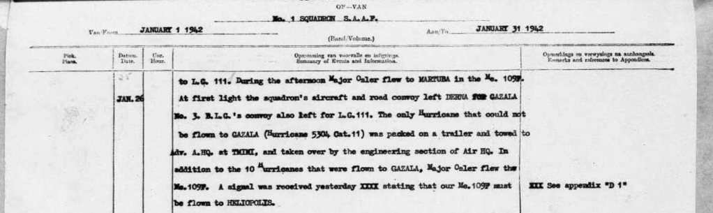 Jan 26 – Squadron’s aircraft and ground convoy left DERNA for GAZALA. Major Osler flew “Yellow 2” again but in the afternoon a signal was received ordering the 109 to be flown to HELIOPOLIS.