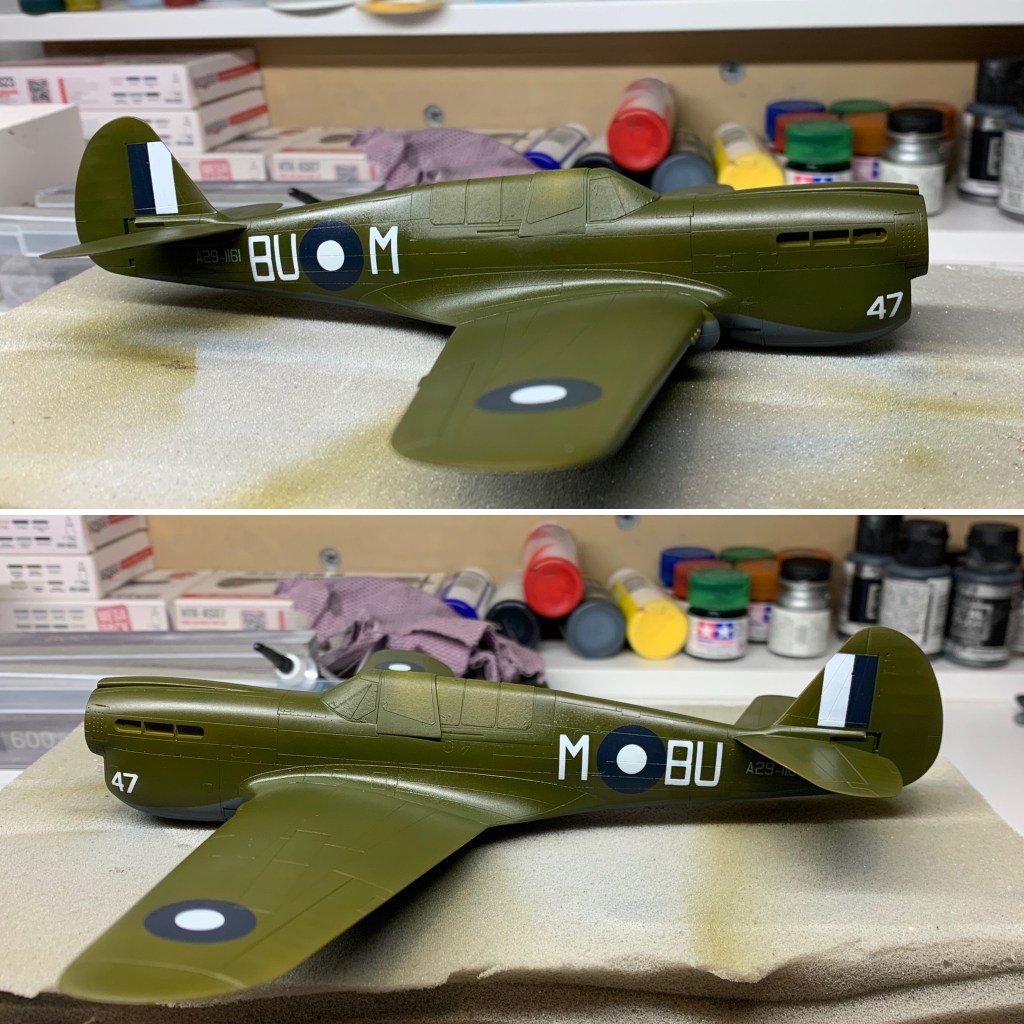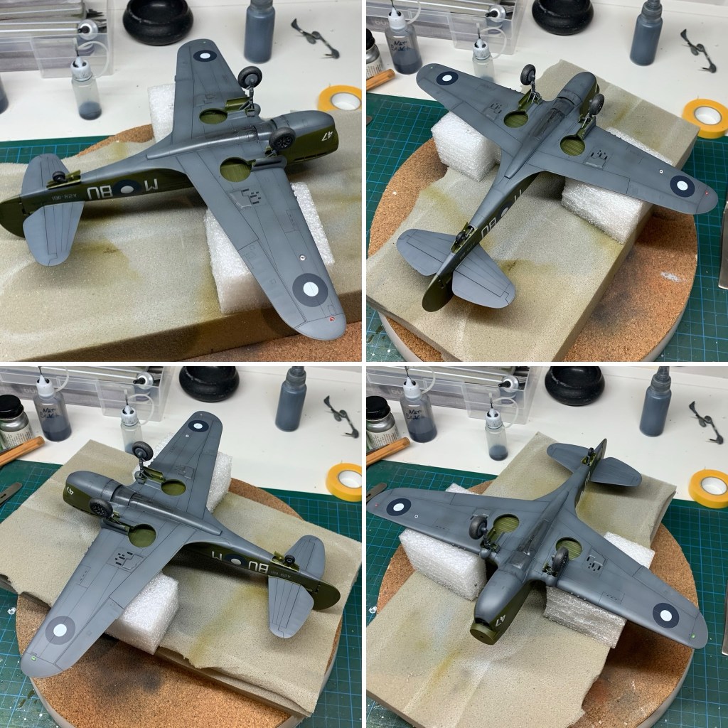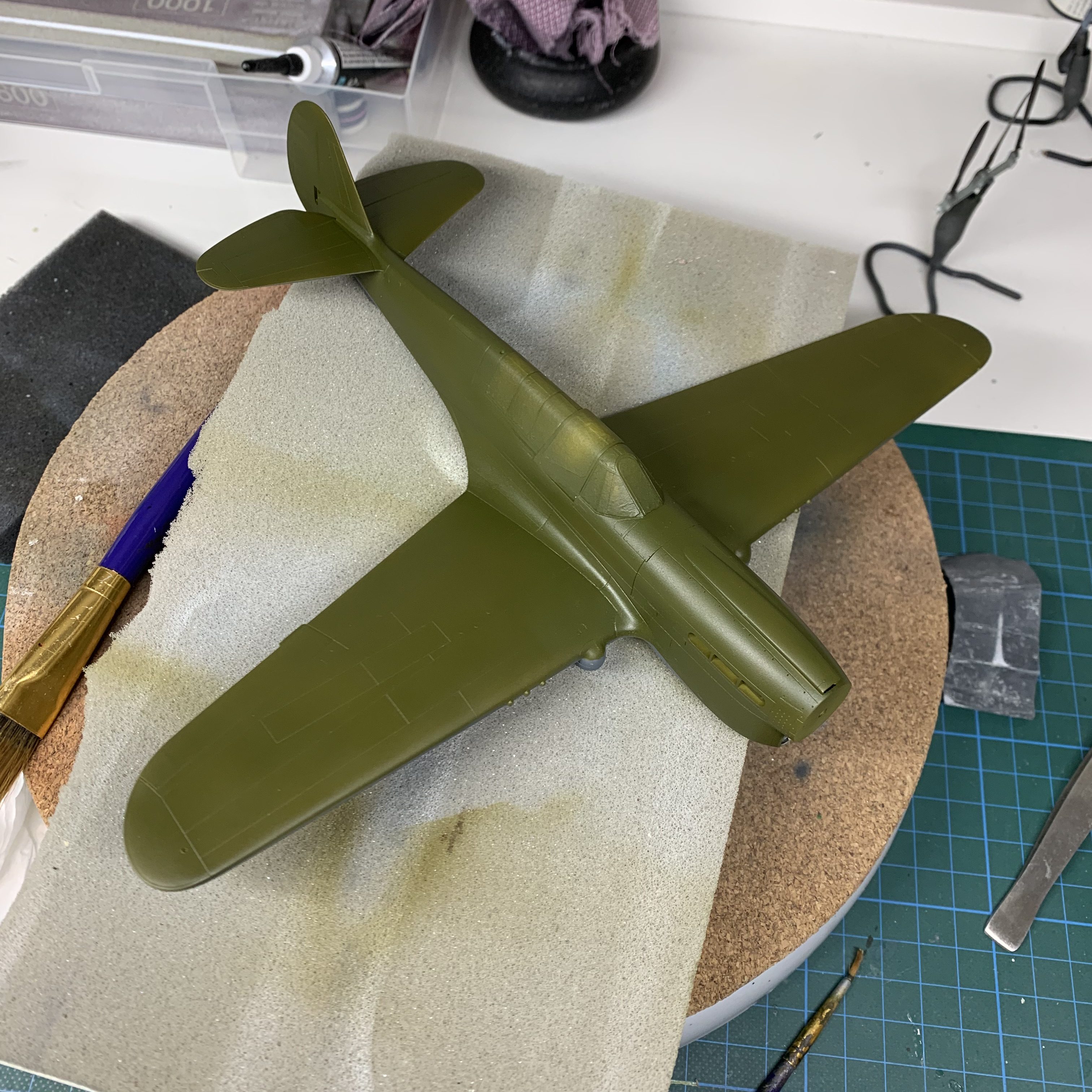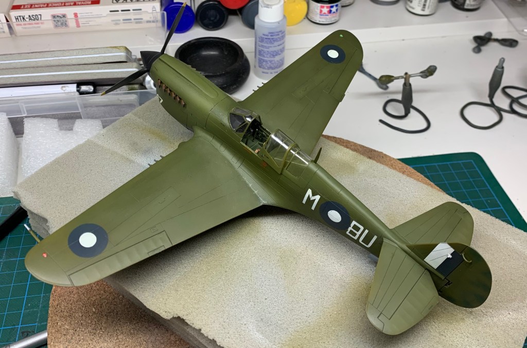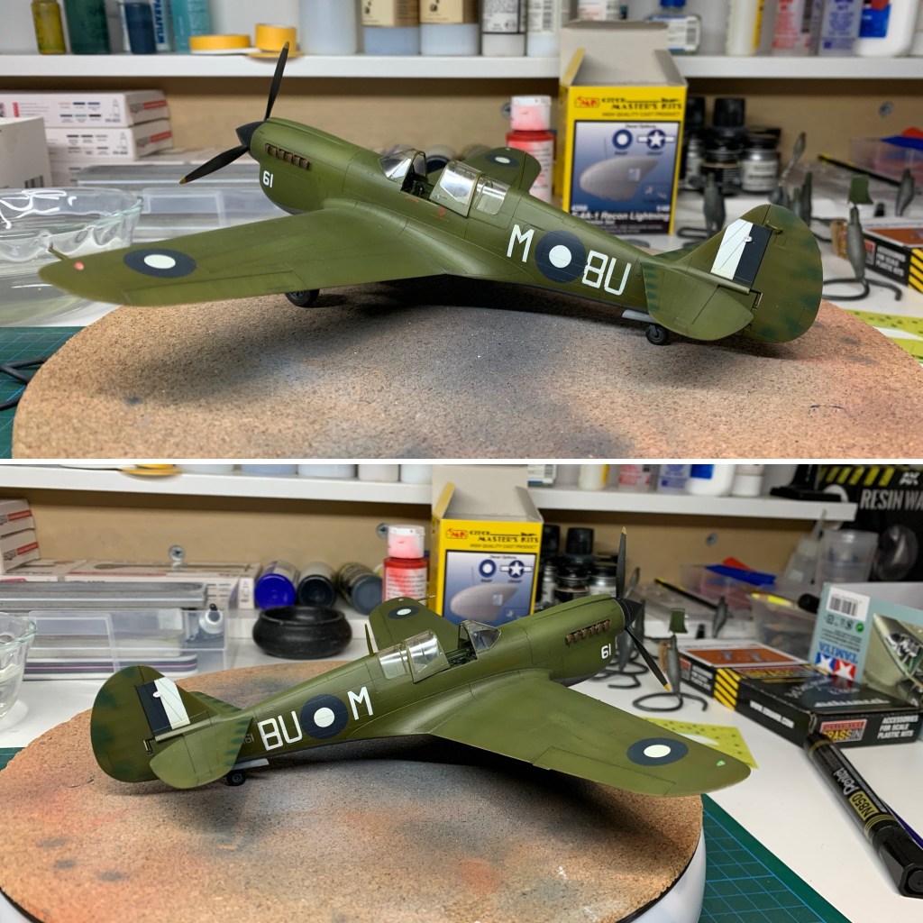 The scheme for No. 80 Squadron’s P-40’s was indeed simple, green over grey. These were US-painted airframes so the colours were Olive Green over Neutral Grey. Monochromatic schemes can be challenging to breath life into but these particular aircraft operated in relatively harsh conditions so I had a little more leeway within which to work.