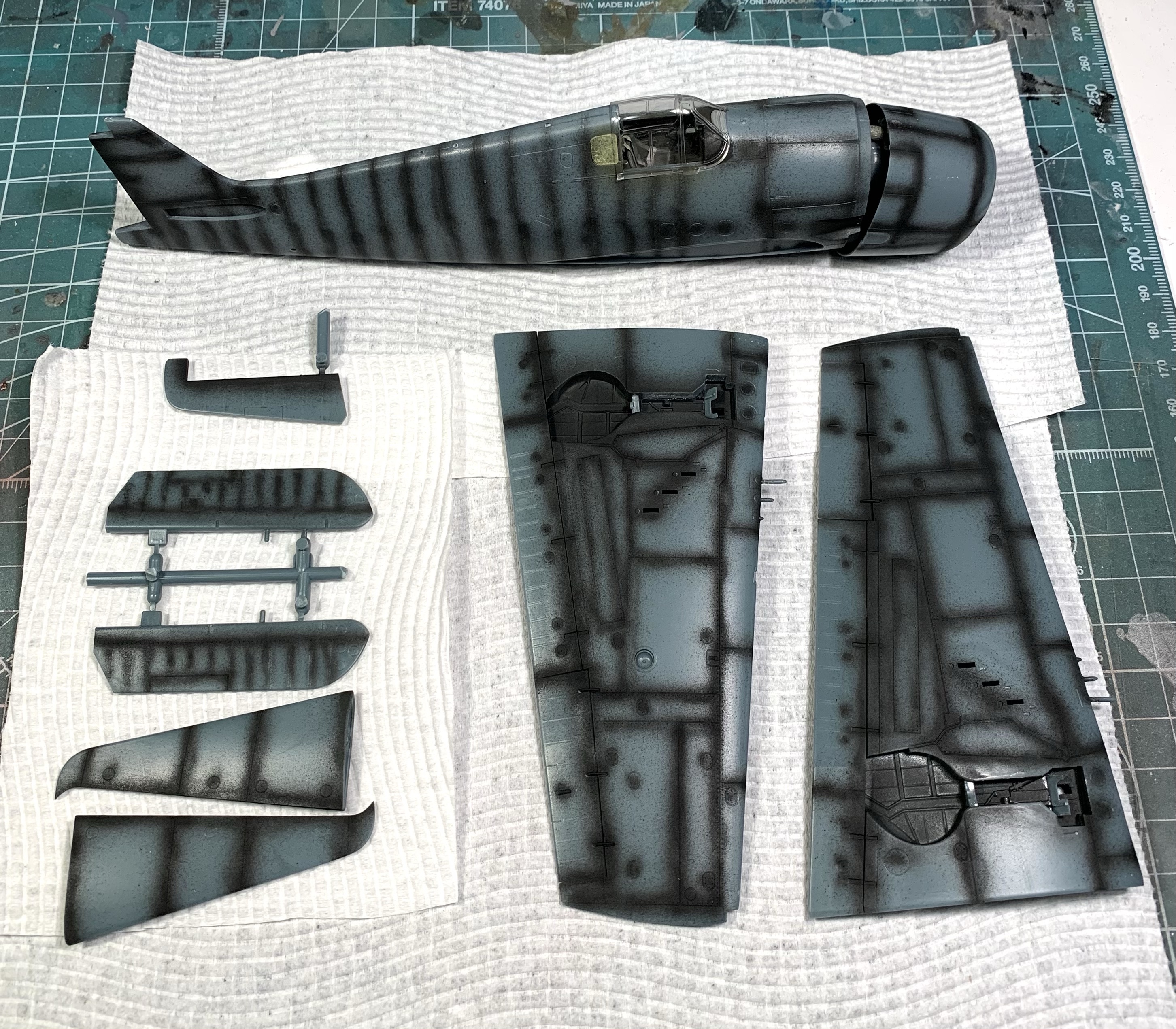 I began the process of replicating this effect with my airbrush applying a very dilute dark grey and Nato Black mix.