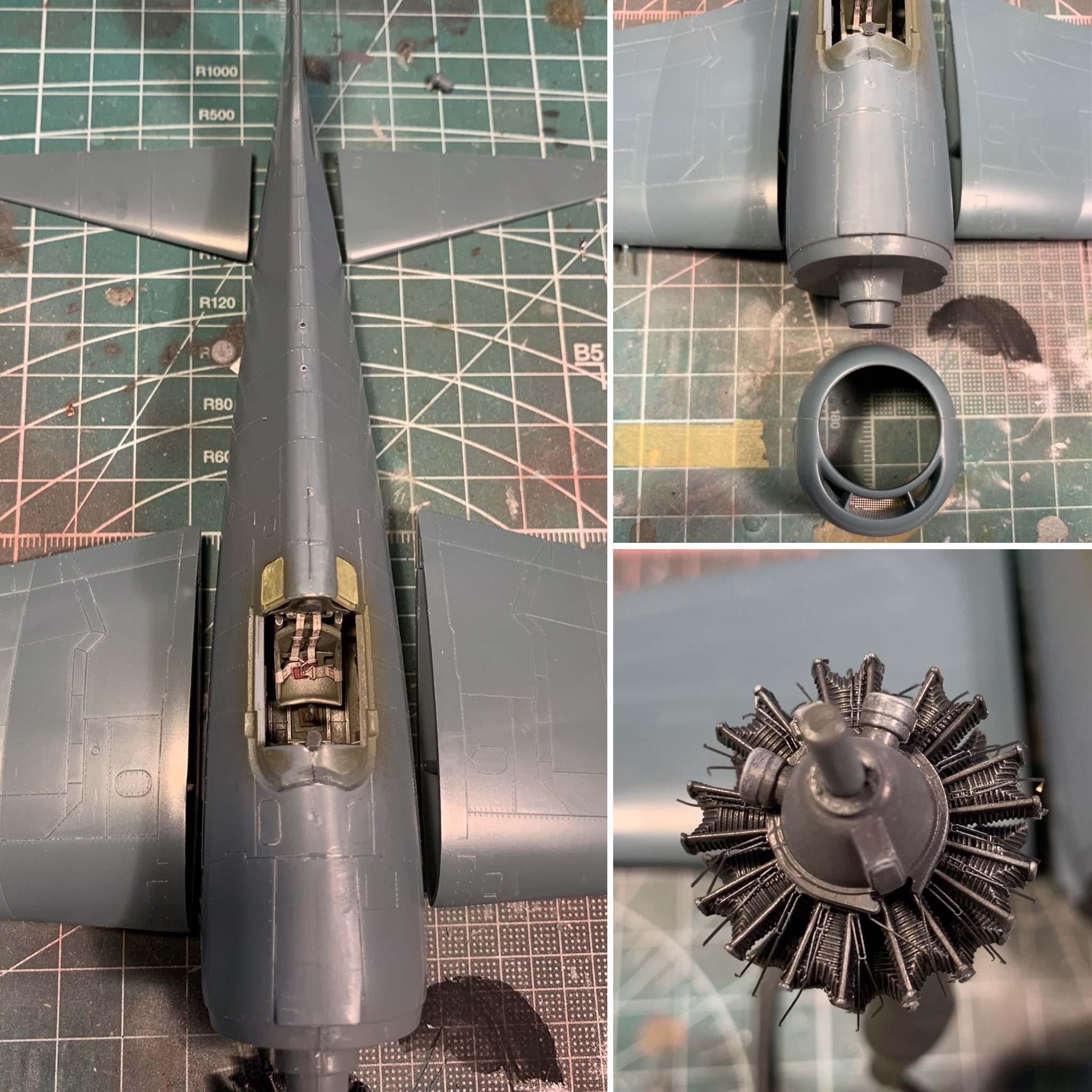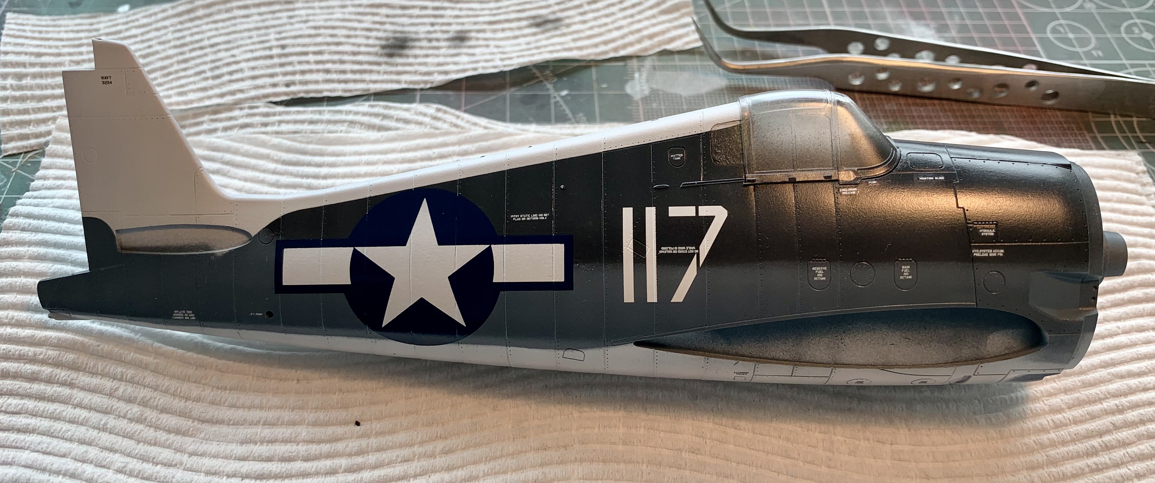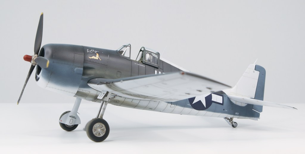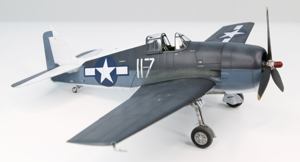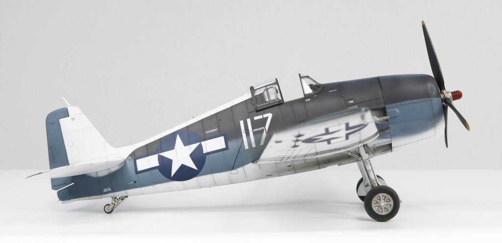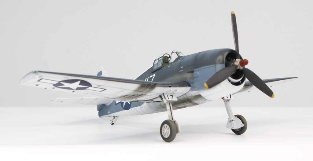 Based on the foregoing I finished my Hellcat as it appears above in the reference photo; used, dirty but not worn out or weathered to within an inch of its life. The airfield it operated from was a coral strip and so some level of wear will be evident of course; the wing roots would have had some wear and tear simply because of the crushed coral that would have inevitably been carried on the pilots and mechanic’s boots when climbing up on them. Likewise, the prop blast would have sent some of the coral into the leading edges and the prop blades themselves would have shown some level of wear. But eight weeks isn’t long enough to have significantly faded the paint on the wings so no patchwork-quilt-post-shading effect on this one.