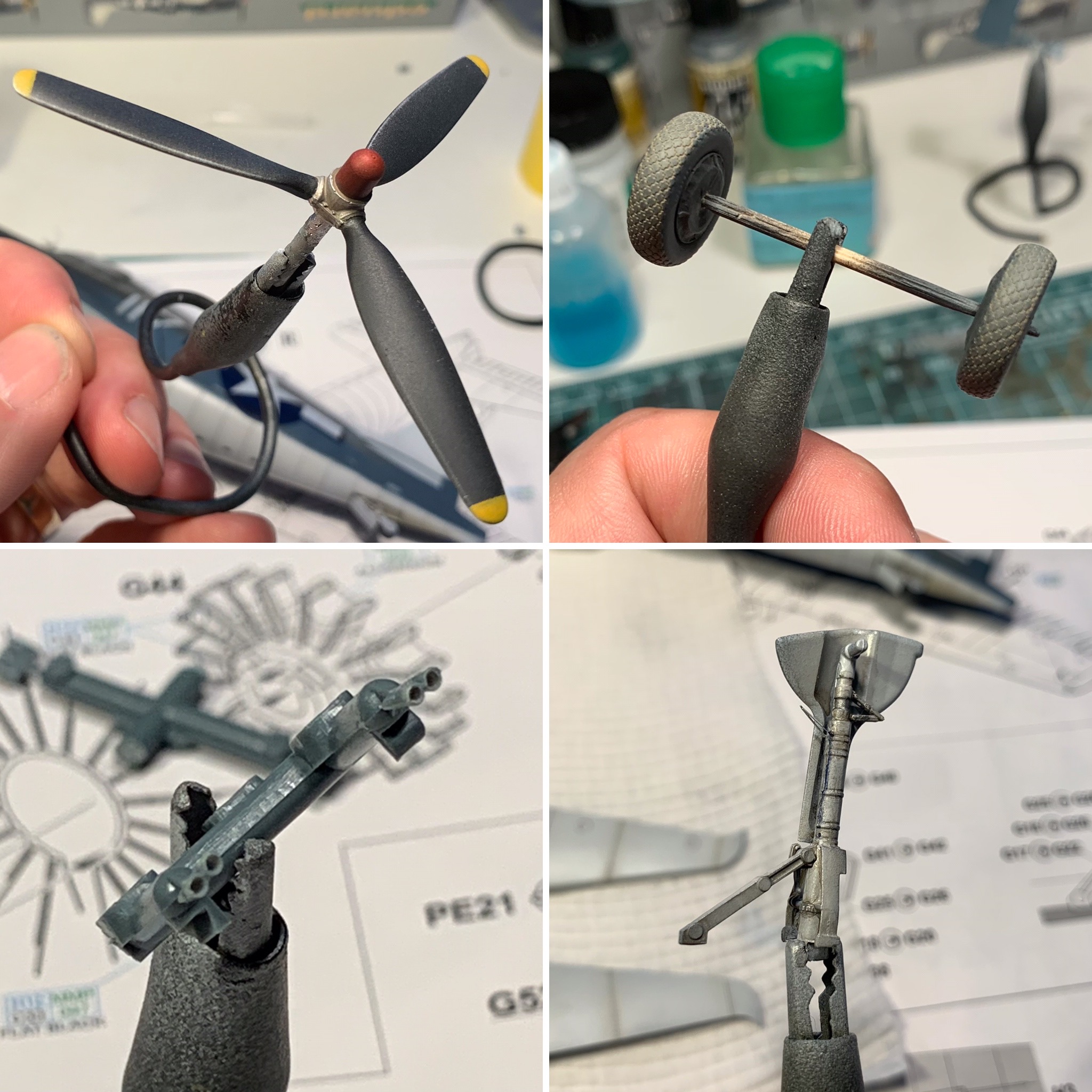 With the major components more or less complete, I turned my attention to the peripheral elements and worked my way through them. The propeller was given a light weathering of a chipped leading edge as this was frequently seen on land-based Hellcats. The wheels – which were exquisitely moulded – were given a weathering which accented the tread pattern, again achieved with a light wash and chalks. I drilled out the exhausts which was painstaking and almost visible on the finished model! The undercarriage is very well done by Eduard – I simply followed the instructions, painted it all white and then weathered with a dark wash.
