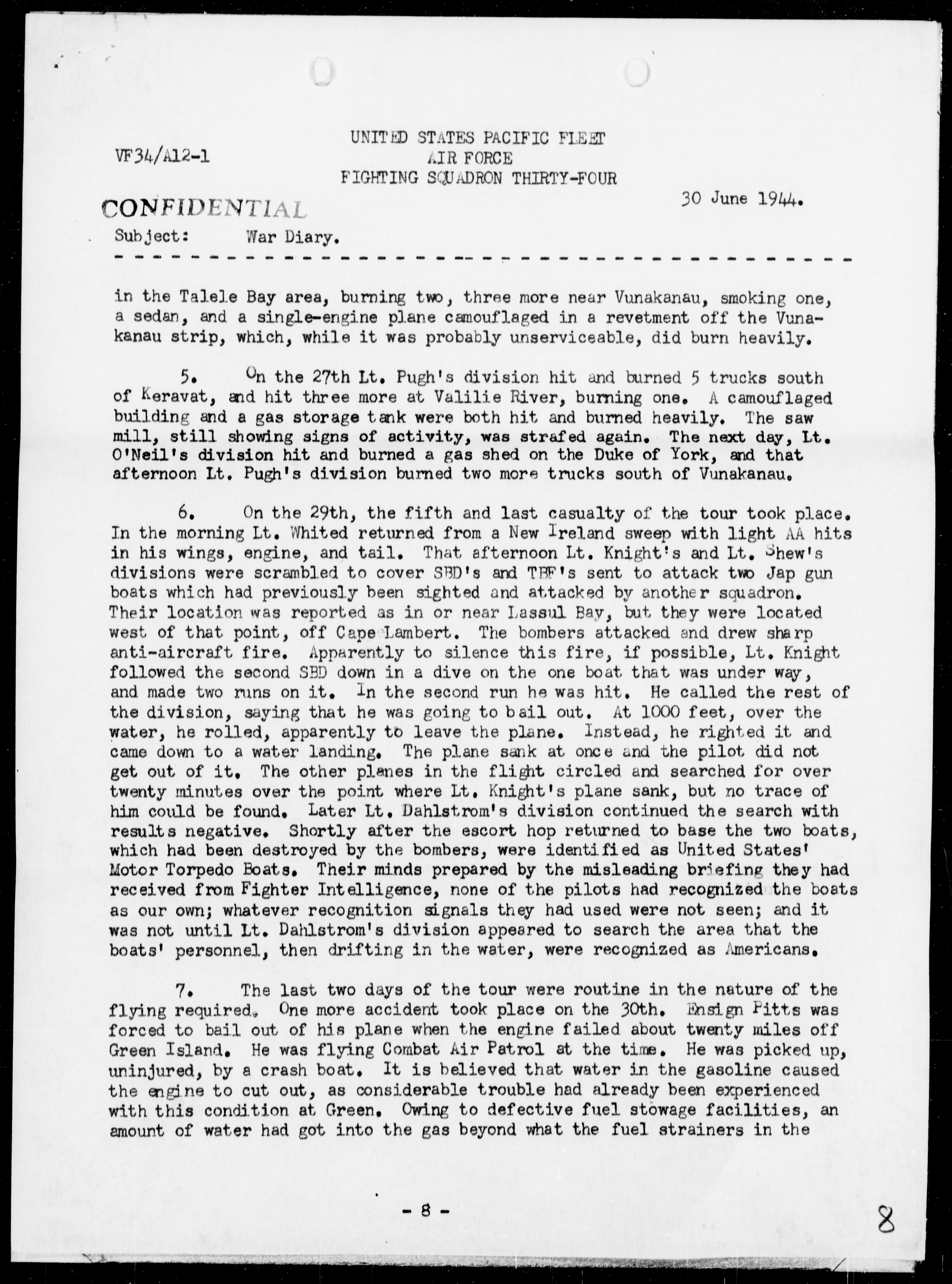 Three days before the end of their tour the squadron suffered its final and most tragic loss. On the 29th Lt. Knight and Lt. Shaw’s divisions were tasked with escorting TBF’s and SBD’s attacking two Japanese gunboats which had been sighted earlier in the vicinity of Lassul Bay. The vessels were sighted by the bombers off Cape Lambert, some way from their last reported position but nonetheless the bombers initiated their attack drawing heavy return fire. In an attempt to draw off or suppress the enemy fire, Lt. Knight dived with the second bomber, making two strafing runs. On the second run his aircraft was hit and he crashed into the ocean. Despite searching for twenty minutes, no trace of him was found. The War Diary describes how the loss unfolded in Point 6. below;