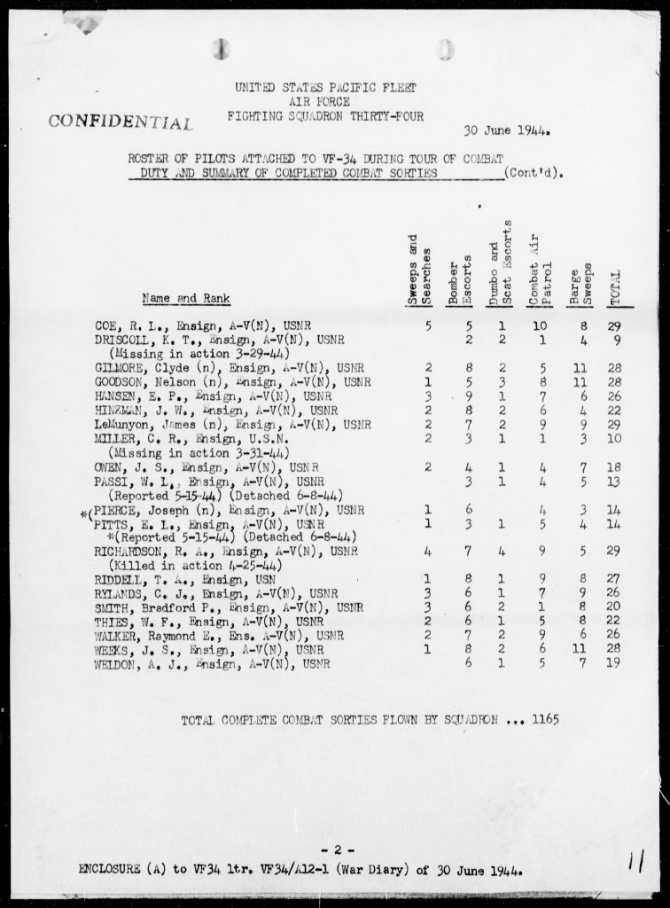 In a tour lasting just fifty-five days the forty-five pilots of VF-34 flew a total of 1,165 sorties from Green Island and 177 from Bougainville. Each pilot averaged around twenty-five sorties, or more or less a sortie every other day. The squadron tallied sorties by pilot, though not their claims so we now only know how many for each pilot, as listed below;