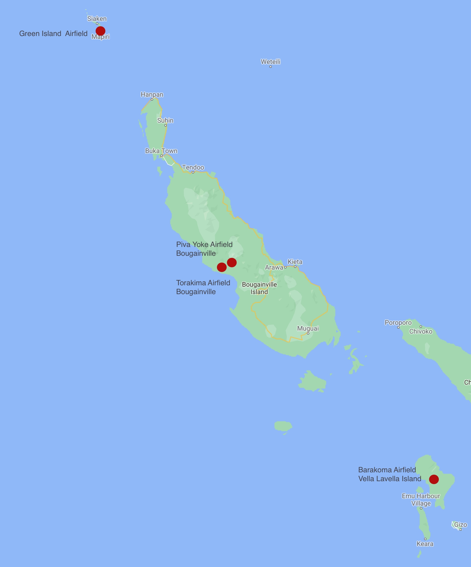 Their tour officially began on 7th March flying from Piva Yoke airfield on Bougainville but, in a clear indication that the enemy was still present and meant to do them harm, the following day the airfield was shelled damaging three of their aircraft and the squadron was forced to move south to Barakoma airfield on Vella Lavella Island. For the next few days operations flown from Barakoma were staged through Torokina airfield on Bougainville but this arrangement proved logistically unsatisfactory and the squadron moved a final time to Green Island (now Nissan Island) and made it their permanent base.